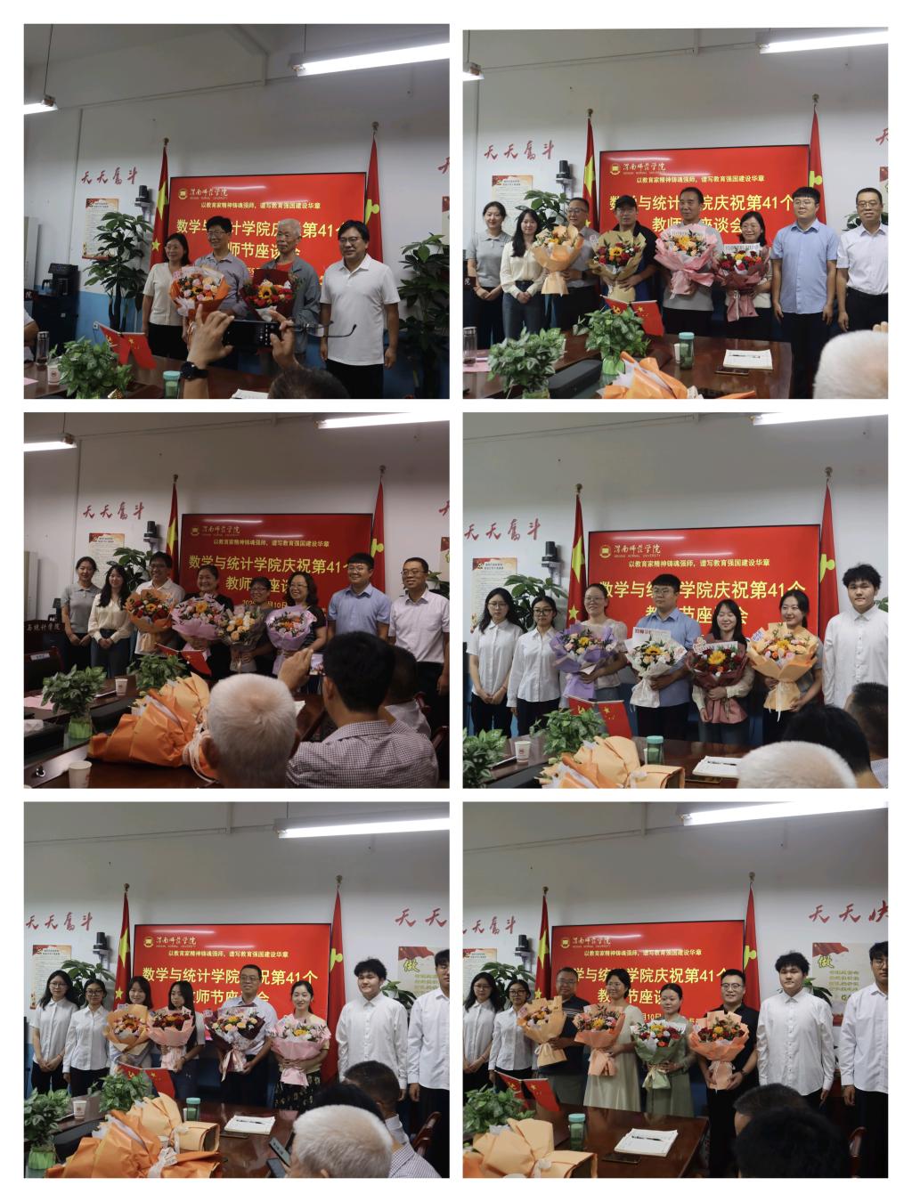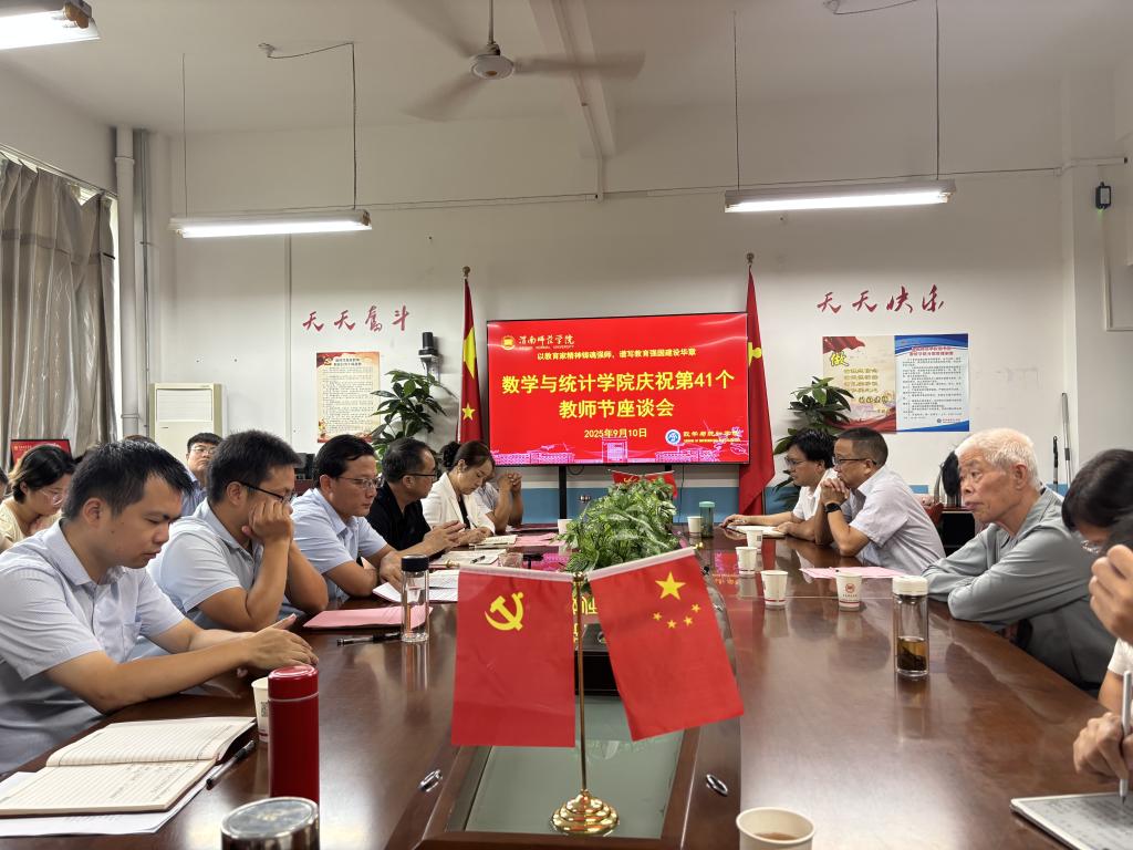 9月10日下午,数学与统计学院以“以教育家精神铸魂强师,谱写教育强国建设华章”为主题在2318会议室庆祝第41个教师节并召开座谈会。学院党政领导班子成员、退休教师代表杜永全和薛利敏老师、一线教师、管理人员以及辅导员代表齐聚一堂,共同庆祝这个属于教育工作者的节日。会议由院长陈斌主持。