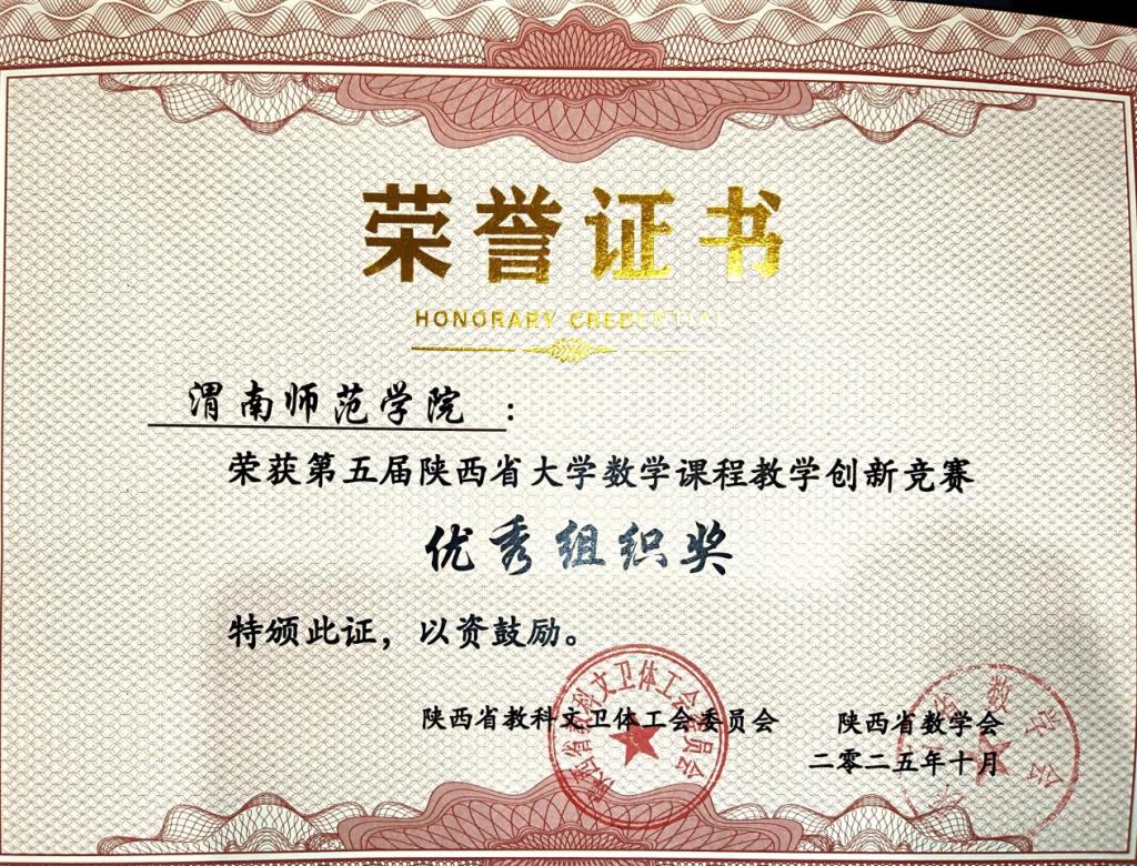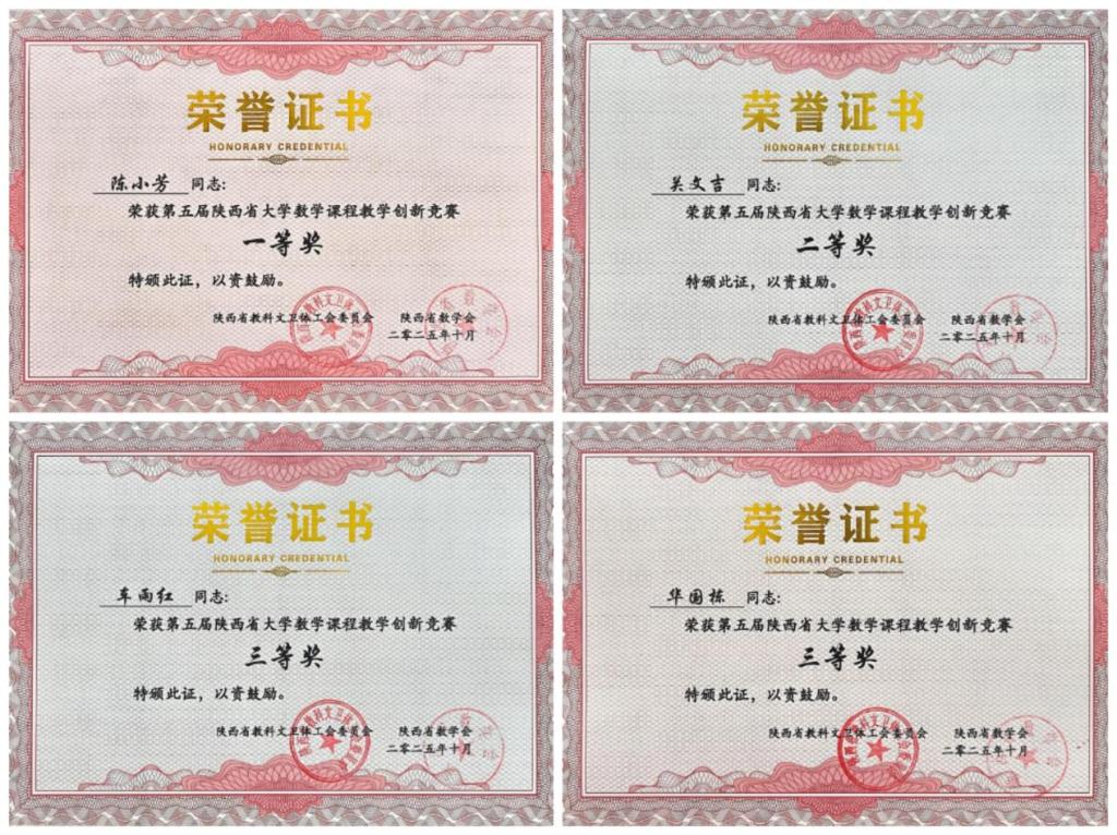 在第二阶段举行的第五届陕西省大学数学课程教学创新竞赛颁奖仪式上,共评选出特等奖7名、一等奖13名、二等奖24名、三等奖33名,并颁发优秀组织奖5个。我校荣获“优秀组织奖”,陈小芳老师获一等奖,关文吉老师获二等奖,车雨红与华国栋老师分获三等奖,成绩斐然。