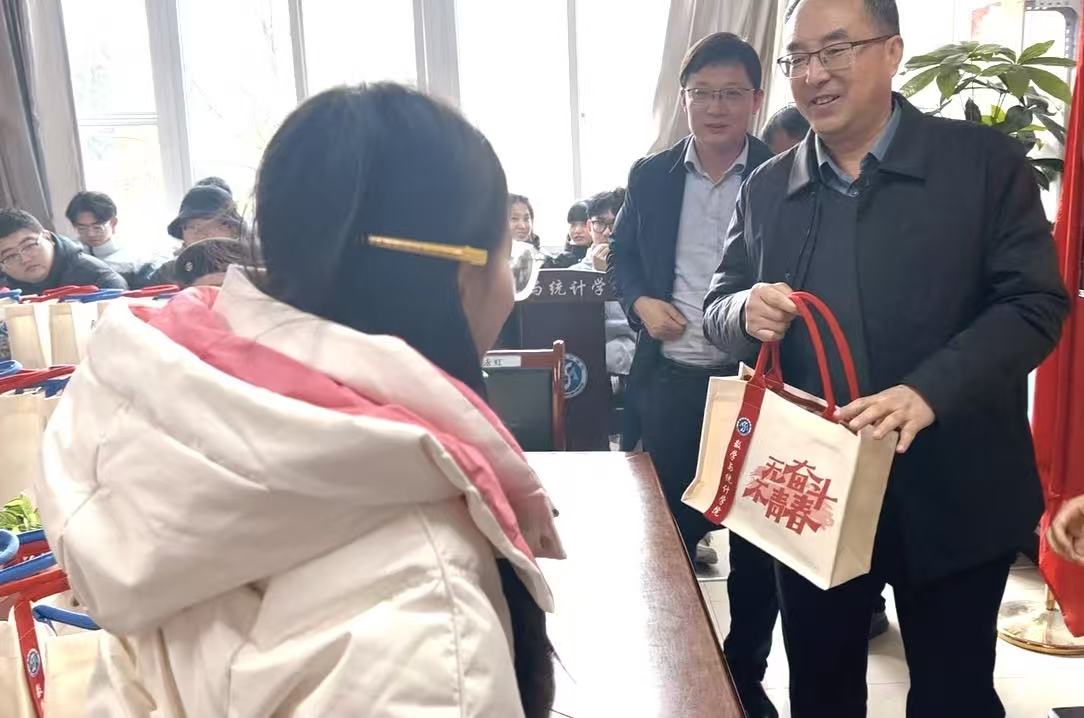 寒意渐浓,考研在即。为鼓舞备考学子士气,传递学院温暖关怀,12月5日上午,数学与统计学院在2318会议室举办2026届考研学生暖心慰问活动,学院党政领导、毕业班辅导员共同为正在紧张备考的同学们送上定制版“考研温暖大礼包”,活动由毕业班辅导员晏小雪主持,现场气氛温馨热烈。