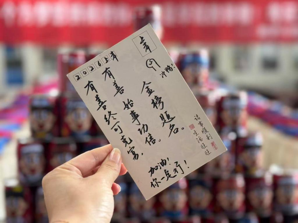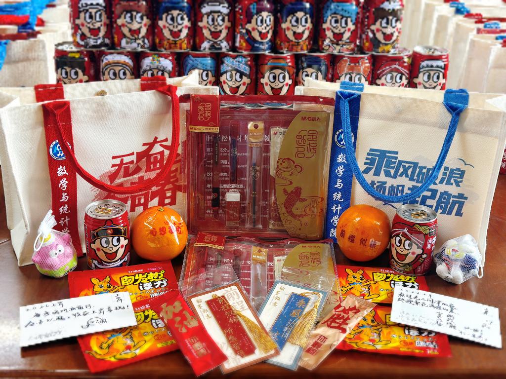 同学们收到实用又寓意深长的礼包后喜悦洋溢。礼包中有寓意“下笔有神,答卷顺利”的锦鲤文具包、“暖心陪伴,冬日温暖”的暖宝宝、“金榜题名,前程似锦”的励志书签、学院师生手写寄语的励志明信片、“身体棒棒,士气棒棒”的激励棒棒糖、“心想事‘橙’,马到‘橙’功”的橙子、“运气旺旺,斗志昂扬”的旺仔牛奶、“捏走压力 动力满满”的解压小玩偶,还有用于整合包装所有物品的定制加油礼袋,处处体现着学院的用心和关怀。张彩霞同学表示:“在冲刺的关键阶段收到学院的礼物和老师的鼓励,心里特别暖,复习也更有劲儿了!”