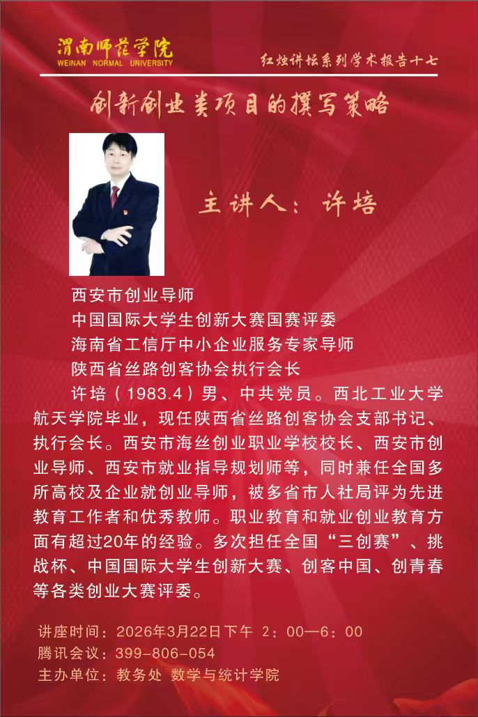 为进一步提升学院学生创新创业能力,规范双创项目申报流程与材料撰写,数学与统计学院于2026年3月22日以线上腾讯会议形式,顺利开展了创新创业类项目的系列专题培训。本次专题培训工作由教学副院长戴磊统筹指导,负责老师王娇主持,全院有意向申报大学生创新创业训练项目和中国国际大学生创新大赛项目的360余名本科生及指导教师共同参与本次培训。
